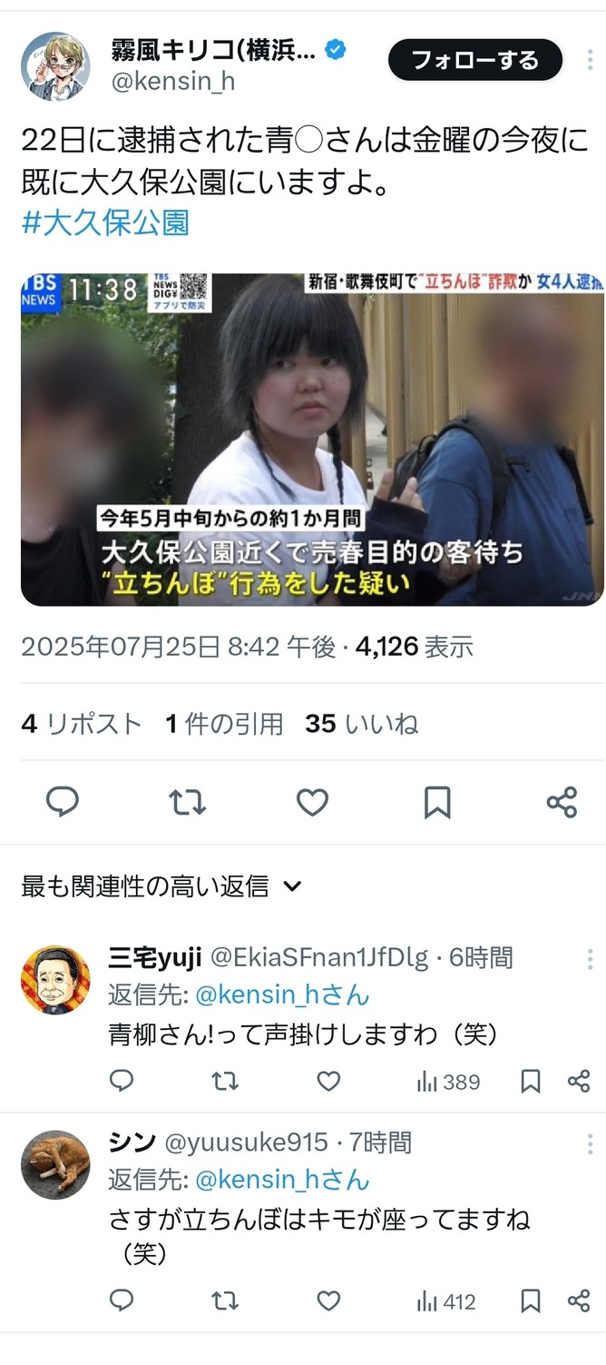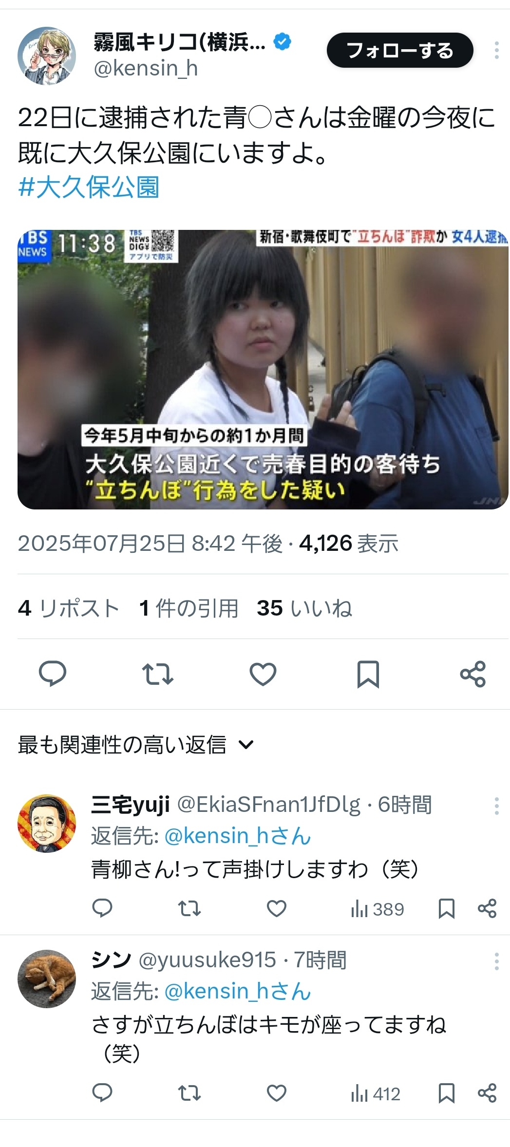 22日に逮捕された青◯さんは金曜の今夜に既に大久保公園にいますよ。#大久保公園 pic.twitter.com/c1zQKfRBTi
