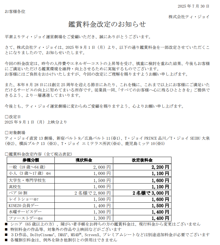 【悲報】映画館の「ティ・ジョイ」、鑑賞料金を2,200円に値上げ