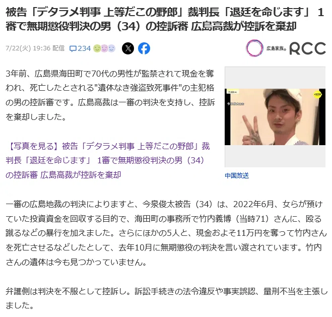このうち債権回収役の今泉俊太被告(34)は、男性に暴行を加えて現金を奪い、遺体を車に積み込んだとして強盗致死や死体遺棄などの罪に問われ、これまでの裁判で被告の弁護士は「男性は被告による暴行で死亡したわけではない」などと主張しましたが、1審の広島地方裁判所は去年10月に無期懲役を言い渡し、被告側が控訴していました。