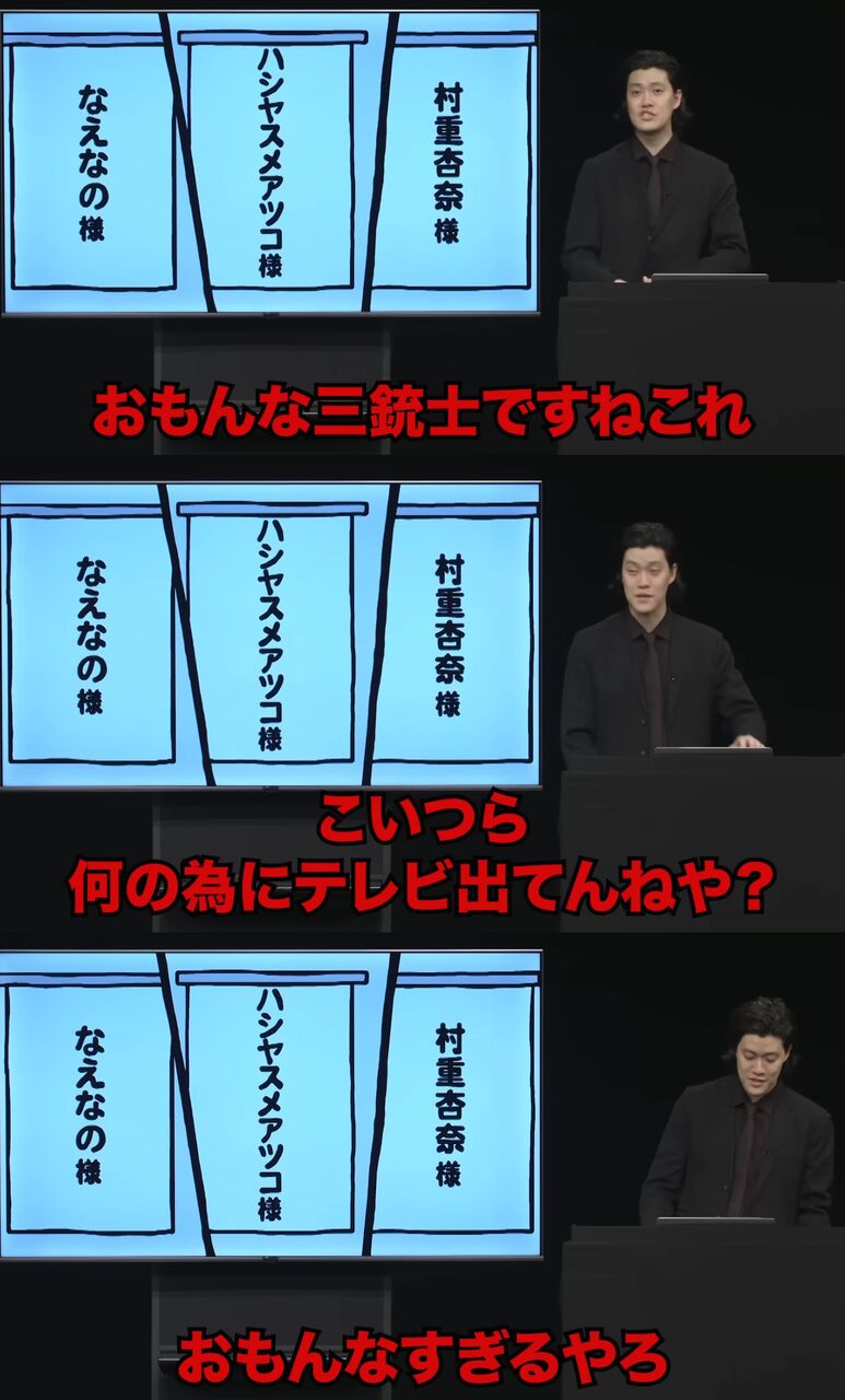 【画像】粗品「こいつらがおもんな三銃士ですねこれ、おもんなすぎるやろ!」→