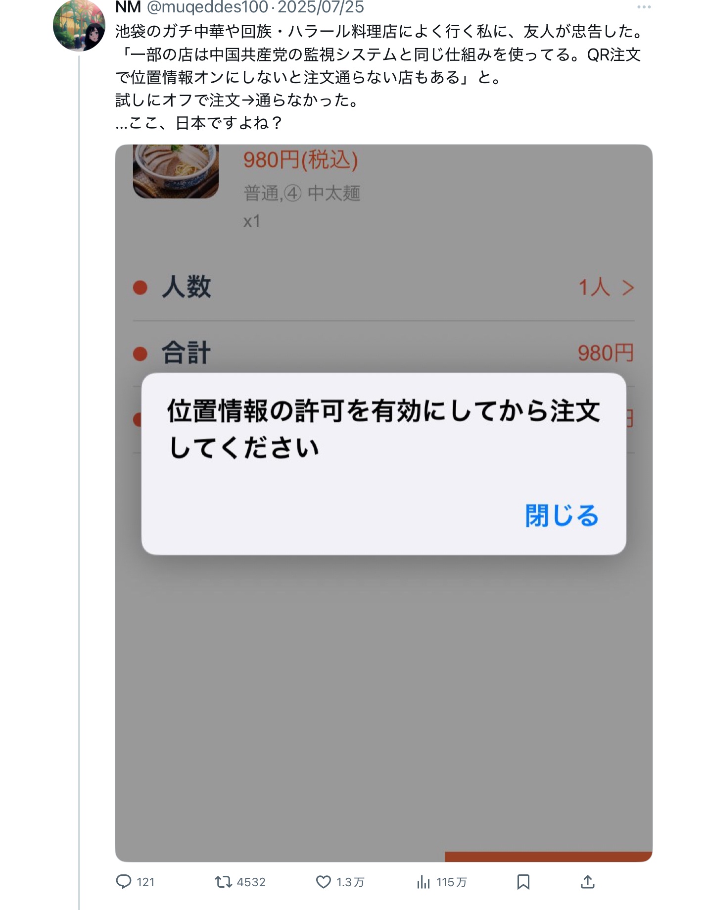 池袋のガチ中華や回族・ハラール料理店によく行く私に、友人が忠告した。「一部の店は中国共産党の監視システムと同じ仕組みを使ってる。QR注文で位置情報オンにしないと注文通らない店もある」と。