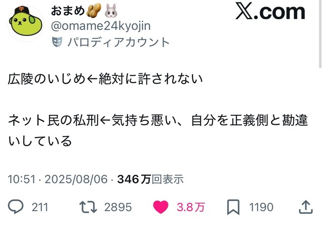 でもそうやって私刑で追い込んだ人達は誹謗中傷等の自覚はなく、「民意を得た」「悪を撲滅した」などという歪んた正義感で悦に浸ってるのが怖い pic.twitter.com/xMGaOOVXdY— ぜろぜろ(野球垢) (@0zeroddd) August 10, 2025