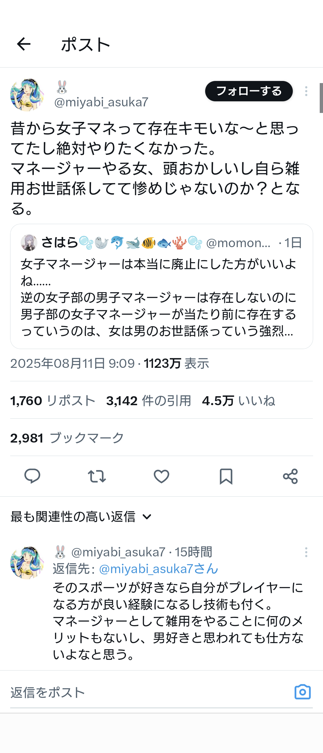 マネージャーやる女、頭おかしいし自ら雑用お世話係してて惨めじゃないのか?となる。 https://t.co/GHZT46mDCK— 🐰 (@miyabi_asuka7) August 11, 2025