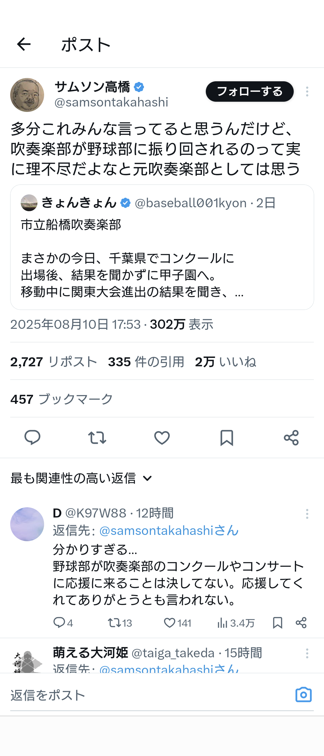 多分これみんな言ってると思うんだけど、吹奏楽部が野球部に振り回されるのって実に理不尽だよなと元吹奏楽部としては思う https://t.co/ya8oI6KxXd