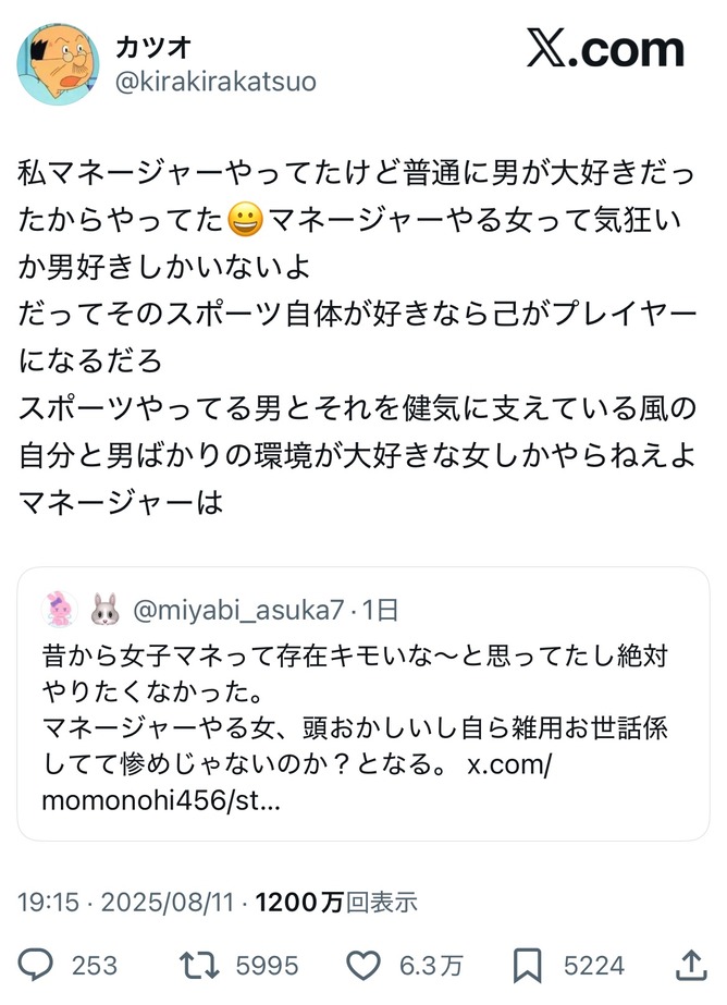 スポーツやってる男とそれを健気に支えている風の自分と男ばかりの環境が大好きな女しかやらねえよマネージャーは https://t.co/OyBJynDp1x— カツオ (@kirakirakatsuo) August 11, 2025
