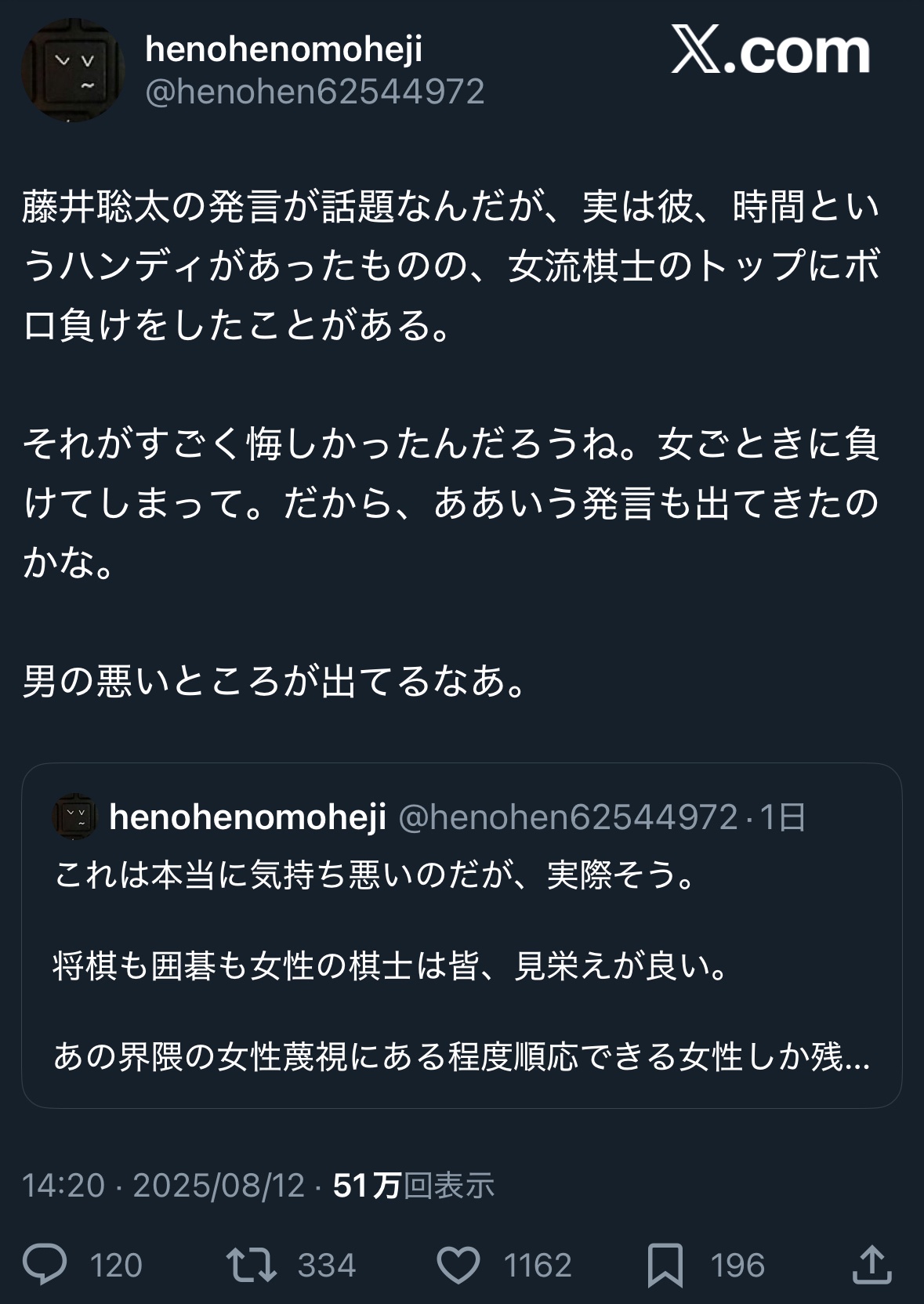 事実でも男の悪い所、じゃなくて藤井聡太の悪い所って書くのが正確じゃないの?
