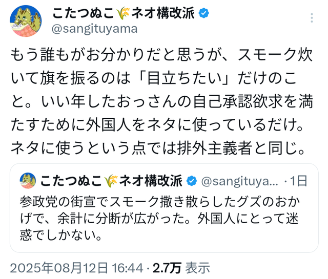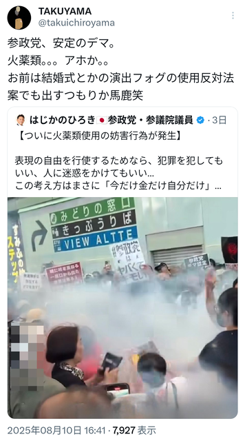 しばき隊「参政党の演説中にフォグミストを使ってスモーク炊いてやった」