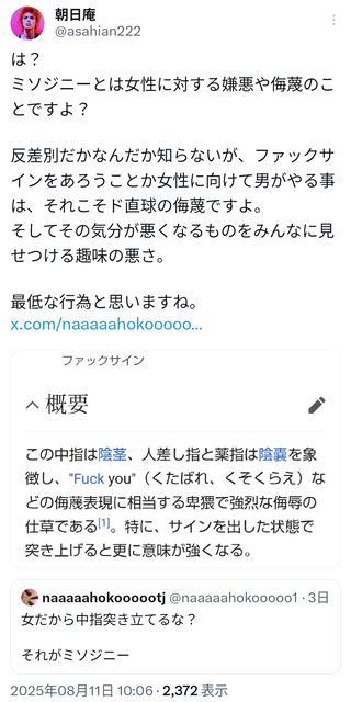 左翼、大激怒「ファックサインは陰茎を表す卑猥な侮辱。男性が女性に対してやるのは最低だろ!」