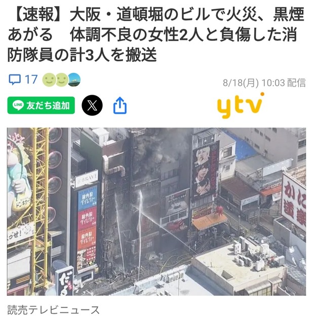 【速報】道頓堀火災 消火活動中の消防隊員2人が死亡 建物6階に取り残された55歳と22歳 ほか消防隊員3人が負傷 ヤフーニュース大阪・道頓堀のビル火災で活動中の消防隊員2人が死亡したことがわかりました。また負傷者は4人、このうち3人が消防隊員です。警察によりますと、午前9時50分ごろ、大阪市中央区宗右衛門町で起きたビル火災では、近隣店舗にいた20代の女性客1人が搬送されたほか、現場で消火活動中の男性消防隊員5人の、計6人が救急搬送されました。大阪市によりますと、死亡が確認されたのは、大阪市消防局で浪速消防署に勤務する消防司令で森貴志さん(55歳)と、同じく浪速消防署に勤務する消防士の長友光成さん(22歳)です。ふたりは消火活動中に建物に取り残されて6階で見つかり、ほかの消防隊に救出されたということですが、搬送先の病院で死亡が確認されたということです。全文はこちらhttps://news.yahoo.co.jp/articles/81221d9c2dce818b7f00f6e04ad2d9958581c697