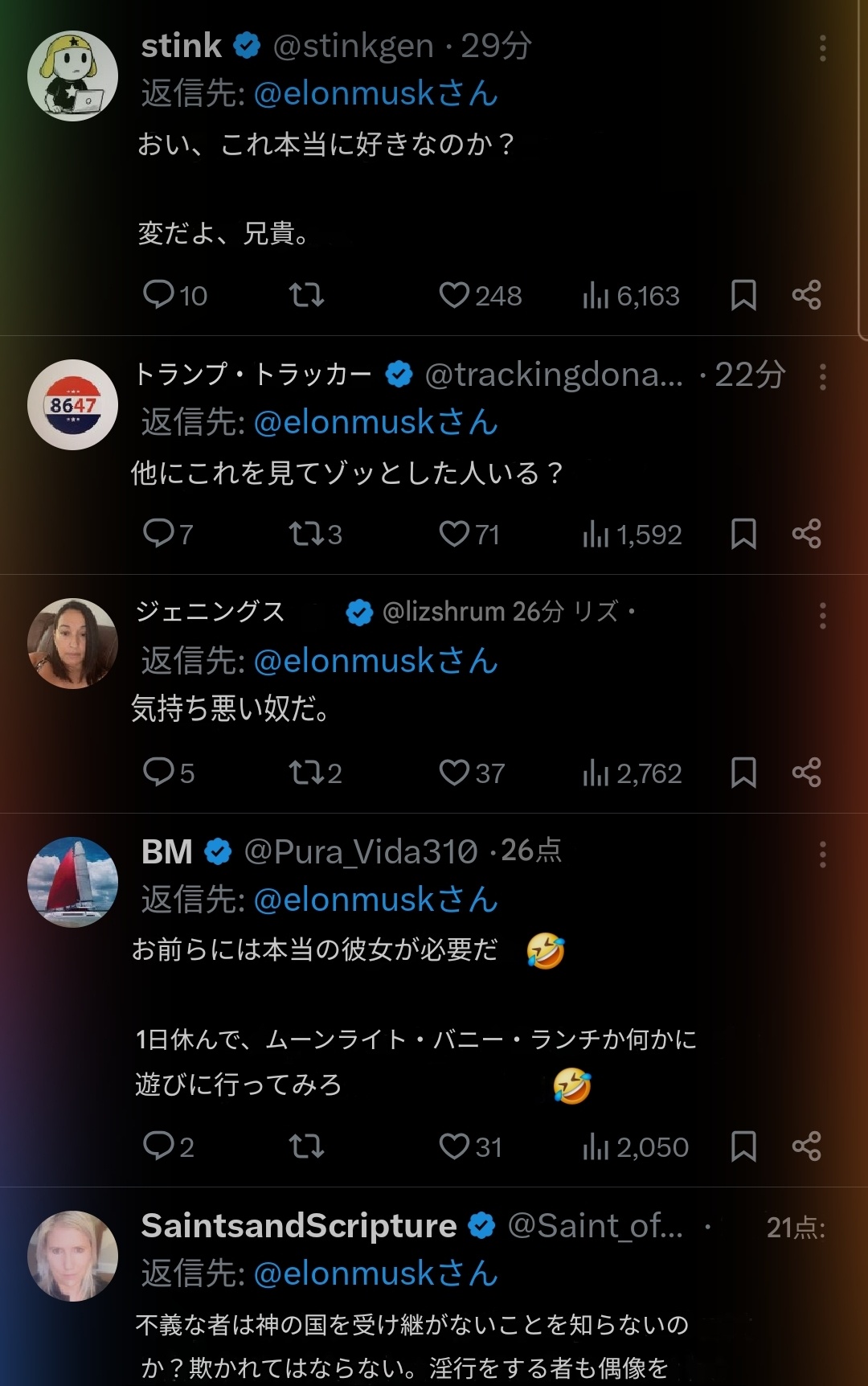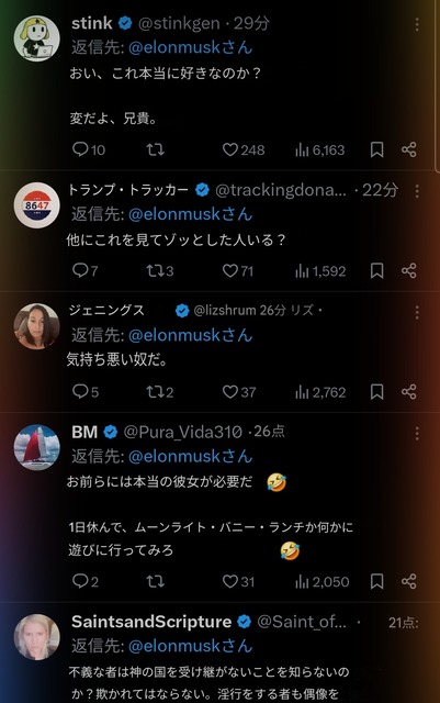 【画像】イーロン・マスクさん、アニメ女に興奮してしまうwwwwwwwwww 2025/8/22 キニ速 1:名無し :2025/08/21(木) 21:08:18.996ID:PVKaFrAj9 2:名無し :2025/08/21(木) 21:08:26.938ID:PVKaFrAj9 イーロンがaniの衣装アップデートに興奮しててキモいと炎上しとる 4:名無し :2025/08/21(木) 21:08:50.534ID:PVKaFrAj9 水着もある 5:名無し :2025/08/21(木) 21:08:51.968ID:3/OUIT5Hy Xユーザー驚愕で草 続きを読む Source: キニ速