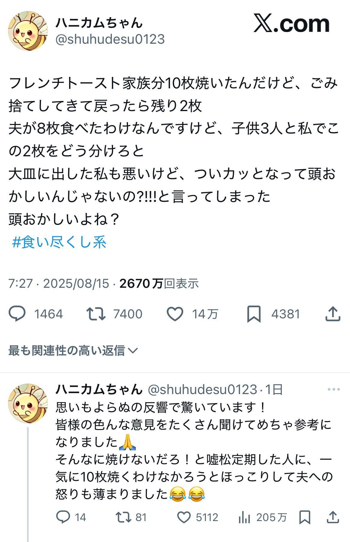 女性「フレンチトースト10枚焼いたら夫に8枚も食われた😡」←嘘松と叩かれまくって垢削除 2025/8/24 哲学ニュースnwk 1: それでも動く名無し 2025/08/24(日) 04:02:57.64 ID:x7JsWz3Ud 続きを読む Source: 哲学ニュースnwk