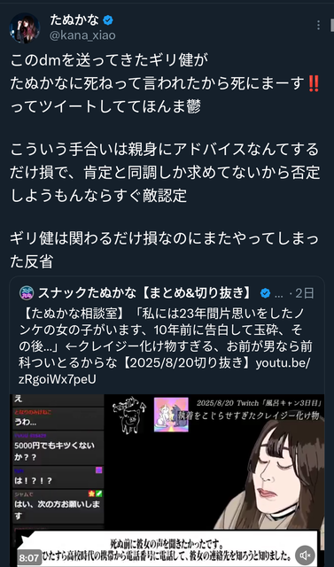 — スナックたぬかな【まとめ&切り抜き】 (@snack_tanukana_) August 24, 2025