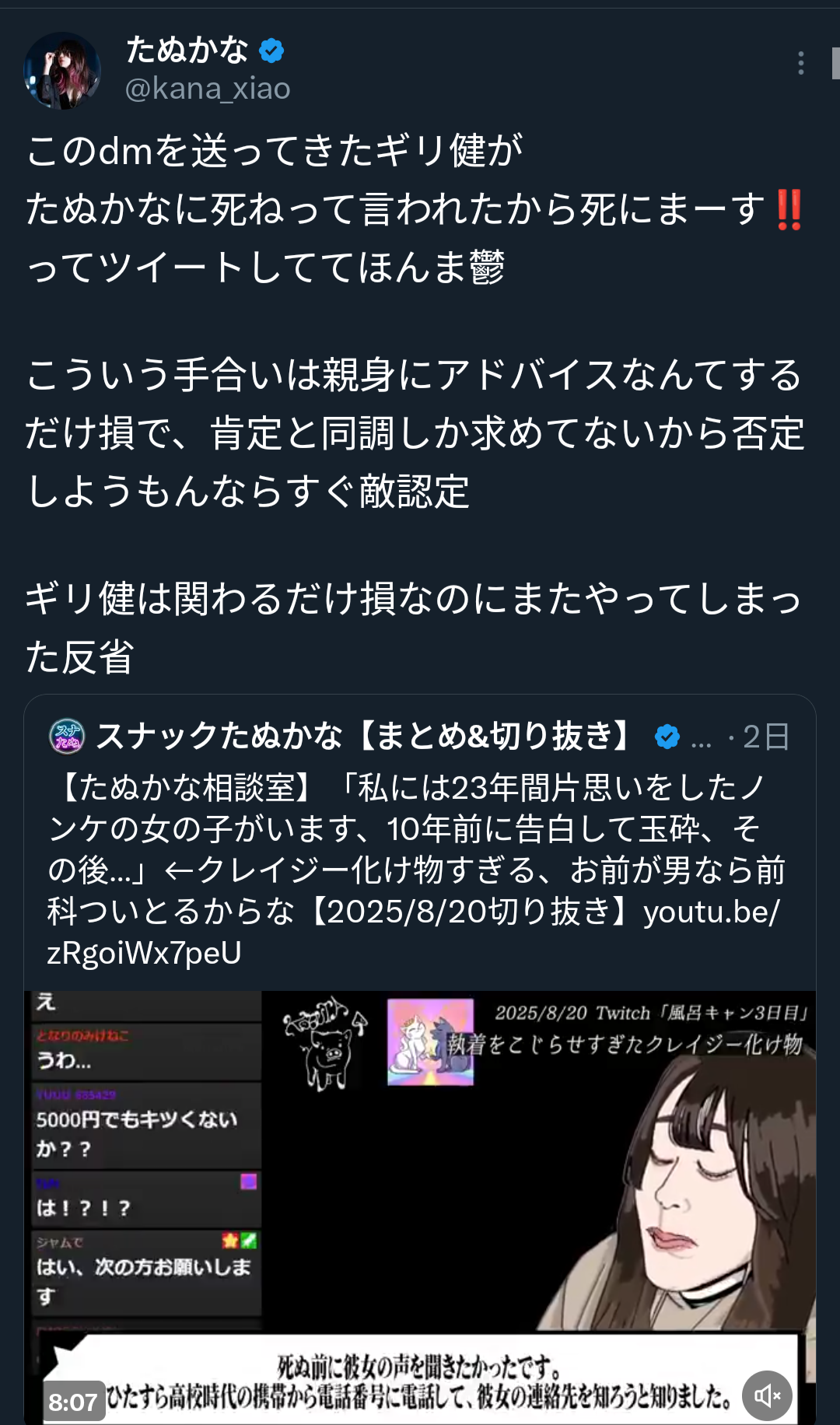 【たぬかな相談室】「私には23年間片思いをしたノンケの女の子がいます、10年前に告白して玉砕、その後…」←クレイジー化け物すぎる、お前が男なら前科ついとるからな【2025/8/20切り抜き】https://t.co/Tut9G4qtxv pic.twitter.com/EhGVdBoRnI