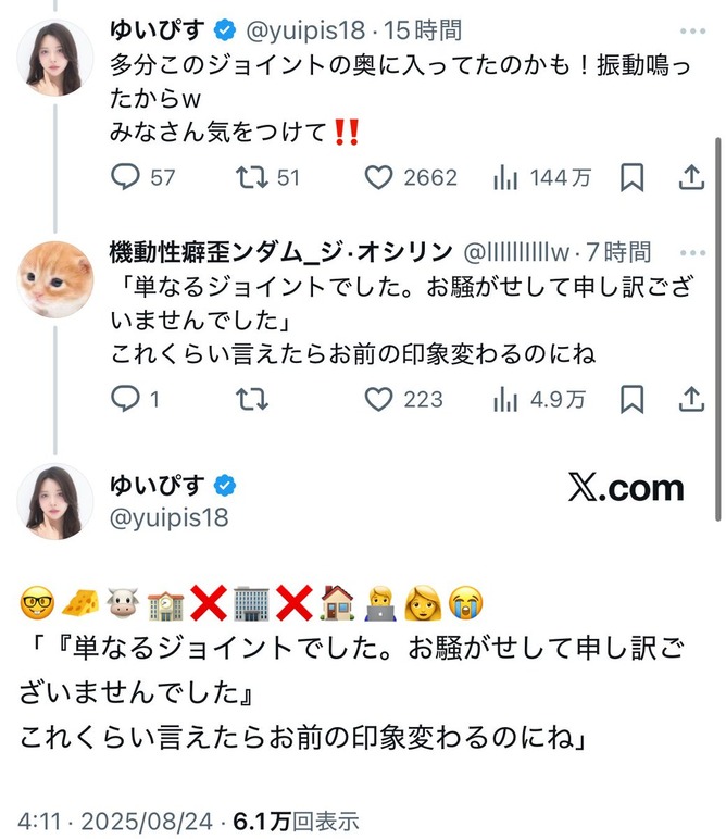 振動鳴ったらしいWWWWW pic.twitter.com/C2o7GMWKLO— ゆいぴす (@yuipis18) August 23, 2025