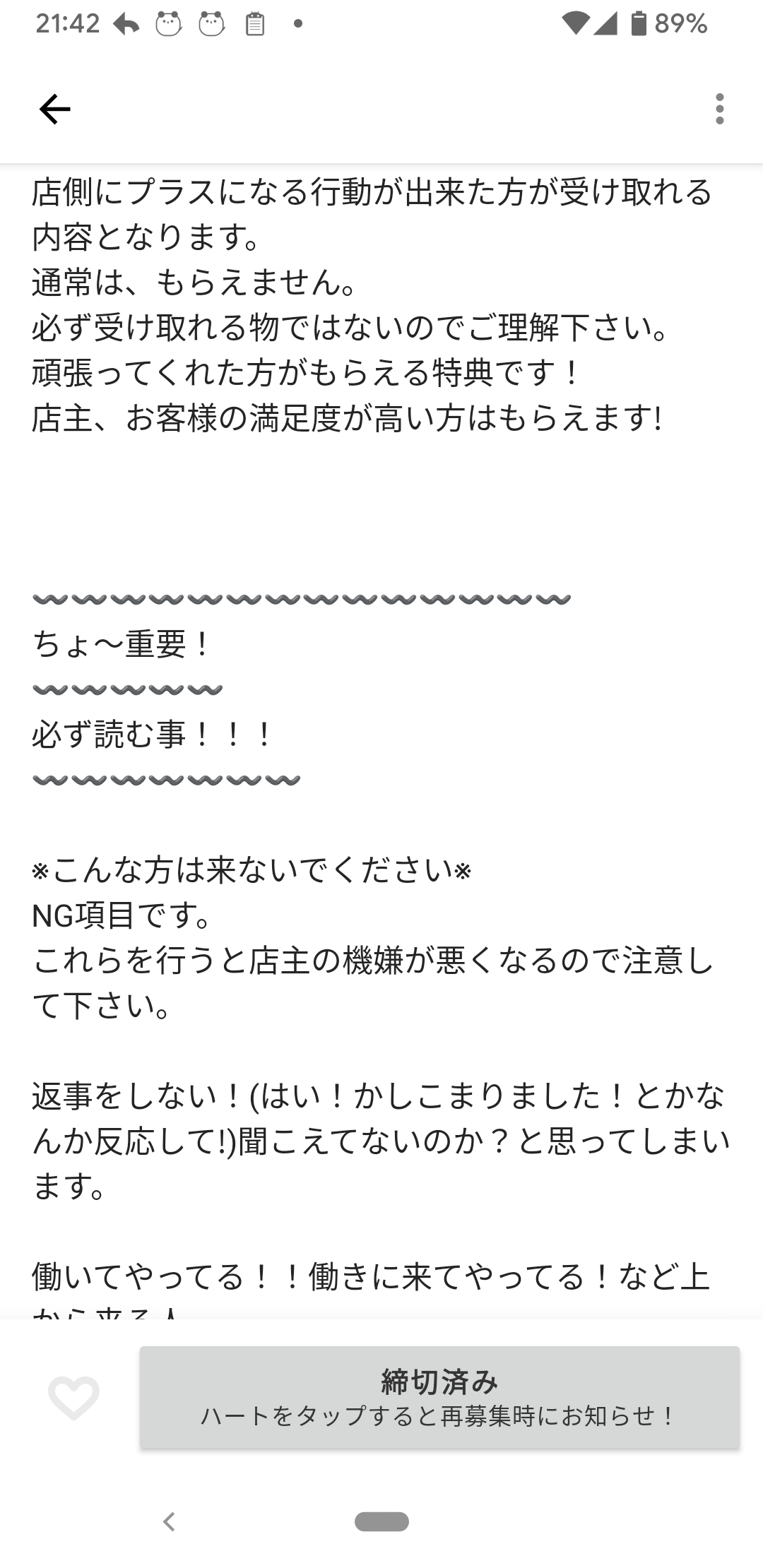 【画像】タイミーの募集欄で短編小説を書く雇用主、現れるwwww 2025/9/2 キニ速 1:名無し: 2025/09/01(月) 21:47:36.025 ID:A4A5/HTyj 2:名無し: 2025/09/01(月) 21:48:21.779 ID:A4A5/HTyj 4:名無し: 2025/09/01(月) 21:48:51.076 ID:A4A5/HTyj 3:名無し: 2025/09/01(月) 21:48:49.972 ID:8PYENKUzo ? 5:名無し: 2025/09/01(月) 21:49:03.308 ID:8/XjrJeuK ワンオペで草 6:名無し: 2025/09/01(月) 21:49:39.029 ID:n2jjTo7aO 1200円でやれる仕事か? 続きを読む Source: キニ速