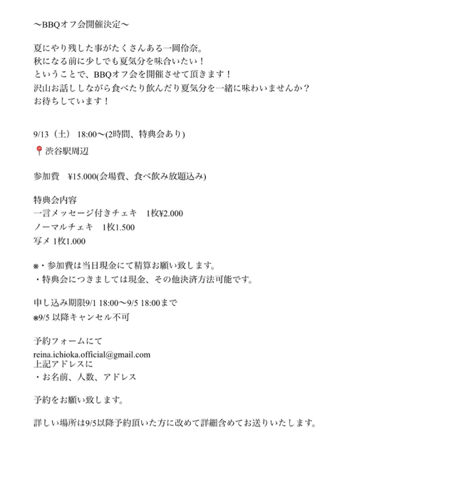 参加お待ちしています☺️ pic.twitter.com/HIhAYZ2yNT— 一岡伶奈 (@reina_ichioka) September 1, 2025