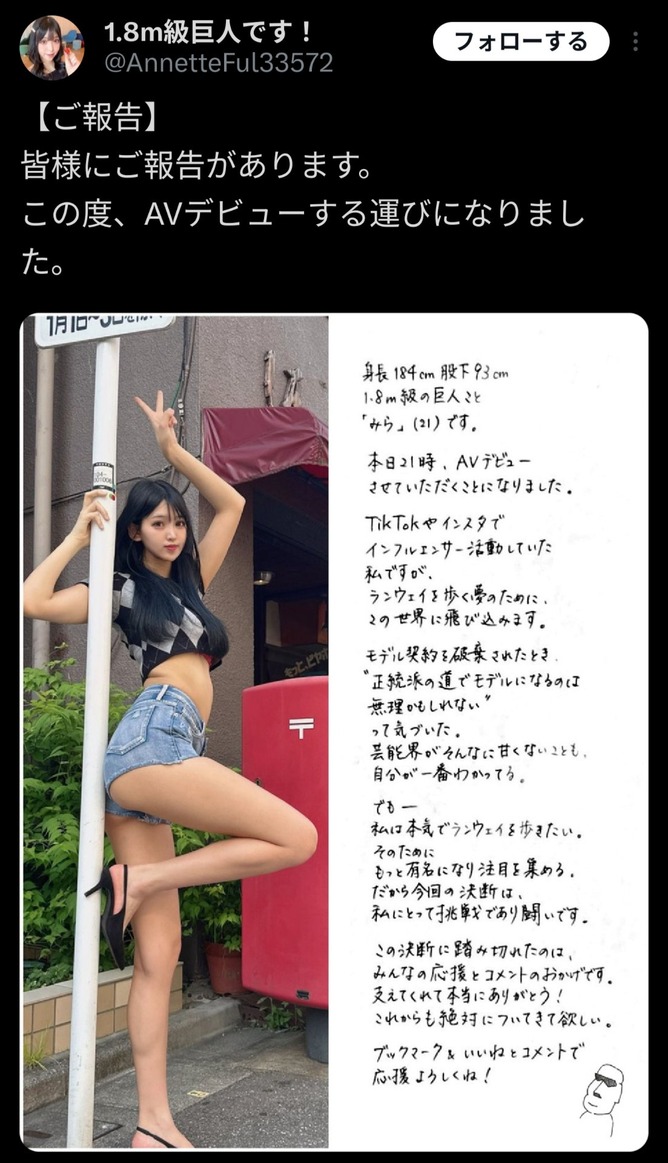 この度、AVデビューする運びになりました。 pic.twitter.com/krGAlAZoKP— 1.8m級巨人です! (@AnnetteFul33572) September 5, 2025
