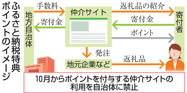 ふるさと納税で寄付した際の特典ポイントの付与を、総務省が10月から事実上禁止する。理由として、ポイントなどによる寄付獲得競争の過熱が制度の趣旨を損なっていると主張。
