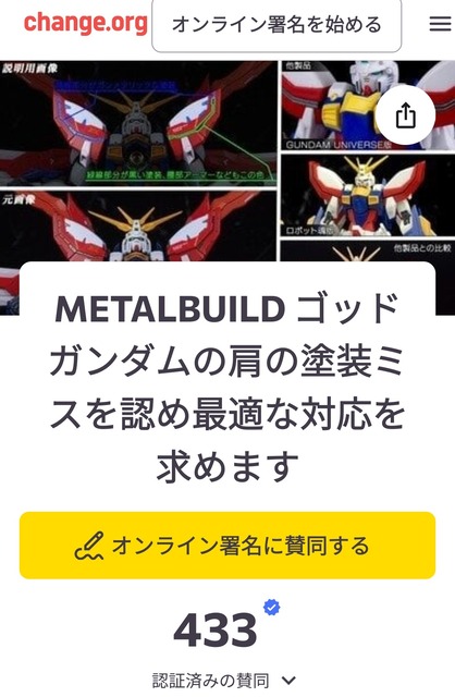 オンライン署名 · METALBUILD ゴッドガンダムの肩の塗装ミスを認め最適な対応を求めます – 日本 · Change.org
