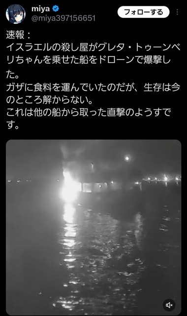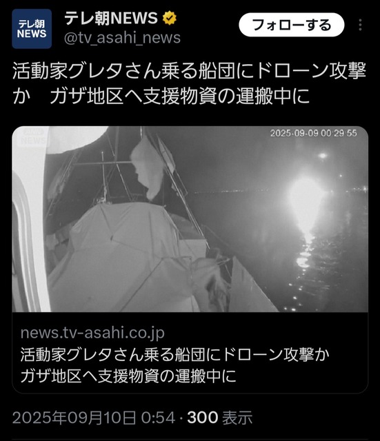 グレタさん乗る船団にドローン攻撃か ガザへの支援物資運搬中 | 毎日新聞パレスチナ自治区ガザ地区へ人道支援物資を届けるため向かっていた「グローバル・スムード船団」は8日、船団のうち1隻がチュニジア領海で「無人航空機(ドローン)の攻撃を受けた」と発表した。乗っていた活動家ら6人は無事だが、船の甲板などで火災が起きたという。全文はこちら