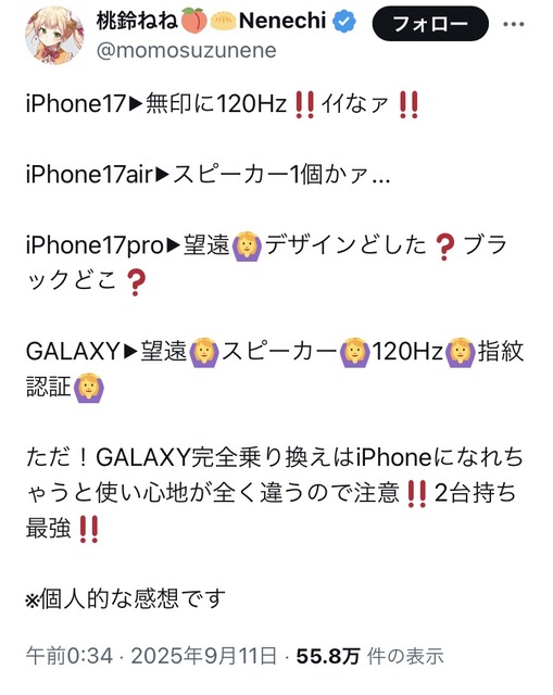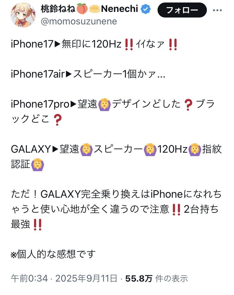 大人気Vtuberさん「iPhoneに足りないところ、GALAXYには全部あるよ!」 2025/9/13 キニ速 1:名無し :2025/09/11(木) 11:57:03.240ID:KLyyJ65Vp 2:名無し :2025/09/11(木) 11:57:38.943ID:KLyyJ65Vp ぐう正論 5:名無し :2025/09/11(木) 11:58:29.869ID:W33yQAn7B GALAXYはホンマ物持ちいいから神 7:名無し :2025/09/11(木) 11:59:00.389ID:ISlAIECuA ねねち、すきだ 続きを読む Source: キニ速