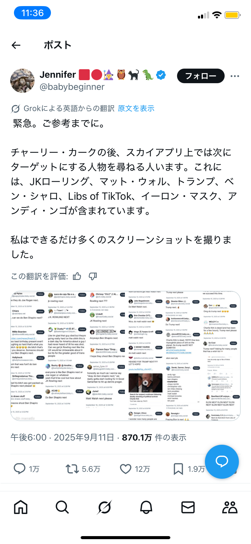 アメリカのX、「チャーリーの次に誰を仕留めるべきか」で大盛り上がりしてしまう 2025/9/13 キニ速 1:名無し :2025/09/13(土) 11:58:11.549ID:2XaJ8izyy ※関連記事【動画】トランプ支持派の男を銃殺した犯人、6mの高さから飛び降りて逃走する映像が凄い 2:名無し :2025/09/13(土) 11:58:17.852ID:2XaJ8izyy 終わりだよこの国 3:名無し :2025/09/13(土) 11:58:24.150ID:2XaJ8izyyチャーリーの次を探してる模様 続きを読む Source: キニ速