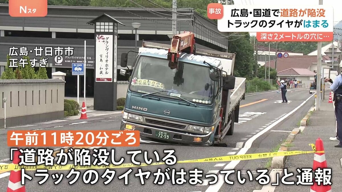 タイヤがはまっちまったァァァ!廿日市・宮島口西の国道2号で道路陥没、トラックがはまる 全面通行止め https://t.co/vJ3YZQDWN1