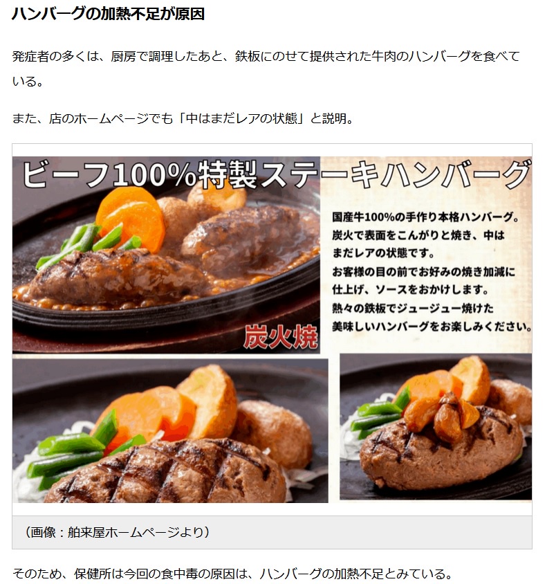 発症者の多くは、厨房で調理したあと、鉄板にのせて提供された牛肉のハンバーグを食べている。