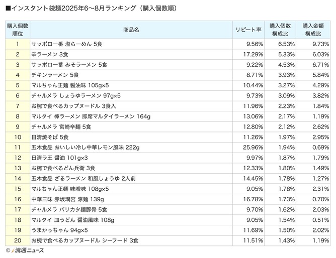 インスタント袋麺 売上ランキング/6~8月は「サッポロ一番 塩らーめん」が1位