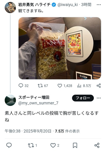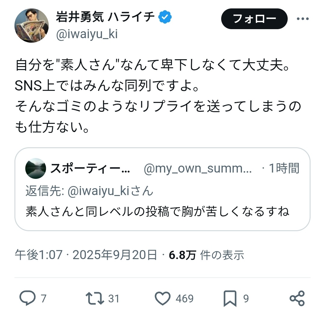 そんなゴミのようなリプライを送ってしまうのも仕方ない。 https://t.co/4wW2am1uZo— 岩井勇気 ハライチ (@iwaiyu_ki) September 20, 2025