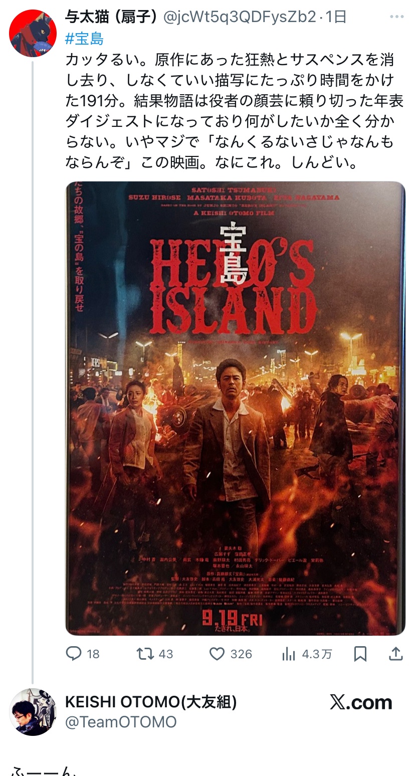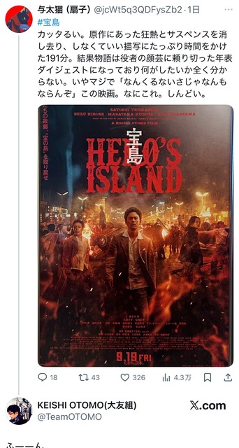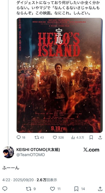 製作費25億円の邦画「宝島」の監督、感想エゴサ後に「ふーーん」→ 2025/9/21 キニ速 1:名無し :2025/09/21(日) 02:27:52.610ID:n2LFRHfnq 22:名無し :2025/09/21(日) 02:45:25.452ID:ZNvnfn9BD なんでこんな反応しちゃうんじゃろ 2:名無し :2025/09/21(日) 02:32:02.988ID:nxPQv0fig わざわざ交通費と時間を使って映画館まで行って映画代2000円出した客にはまず感謝だろ 続きを読む Source: キニ速