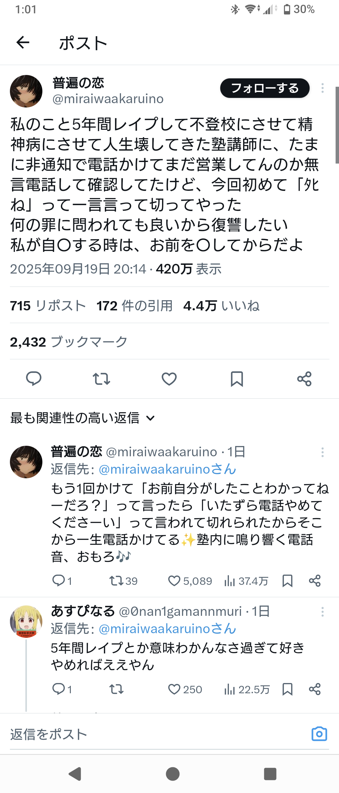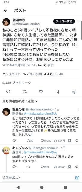 【悲報】塾講師に5年間レ●プされ続けた女さん、復讐に殺○予告をしてしまう 2025/9/21 キニ速 1:それでも動く名無し :2025/09/21(日) 01:02:47.53ID:ycG6roXQ0 2:それでも動く名無し :2025/09/21(日) 01:03:37.39ID:Z1otYQyB0 着拒されない時点で嘘松 12:それでも動く名無し :2025/09/21(日) 01:06:43.95ID:EqQ99BcT0 >>2 塾の電話やろ 非通知は避けようがない 続きを読む Source: キニ速