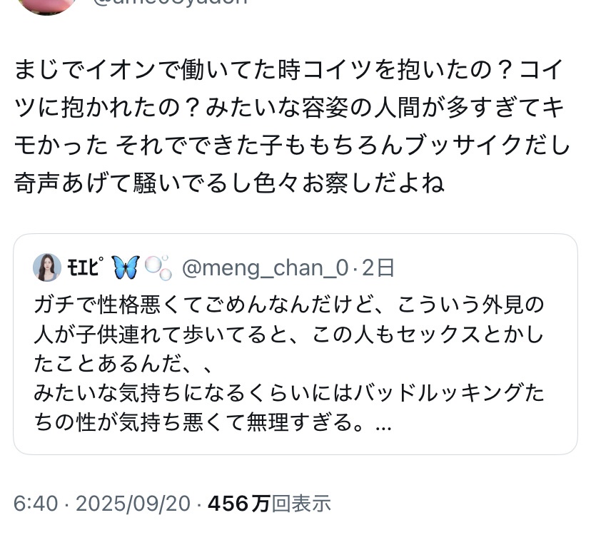 ブスの性無理すぎてAV見れないまである。 https://t.co/20oMvj85JL— モエピ🦋🫧 (@meng_chan_0) September 19, 2025
