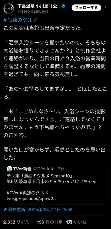 この回実は当館も出演予定だった。「温泉入浴シーンを撮りたいので、そちらの大浴場お借りできませんか?」と制作会社より連絡があり、当日の日帰り入浴の営業時間を調整するなどして準備するも、約束の時間を過ぎても一向に来る気配無し。… https://t.co/BpFzgL9WTc