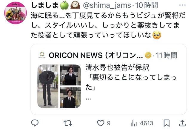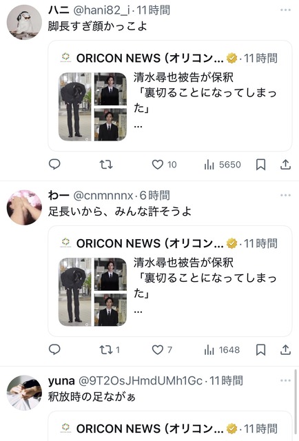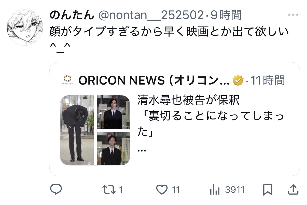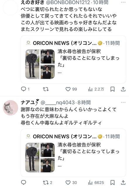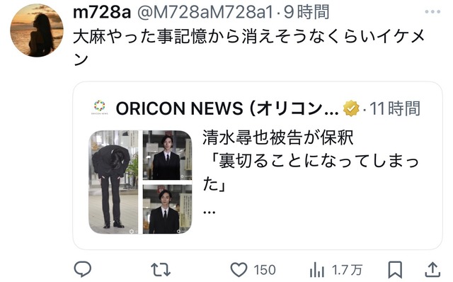 清水尋也被告 ネットざわつく黒スーツ姿「保釈のビジュじゃない」「映画のワンシーン」「スタイル良すぎ」(スポニチアネックス) – Yahoo!ニュース大麻を含む植物片を所持したとして、今月3日に警視庁薬物銃器対策課に麻薬取締法違反の疑いで逮捕され、22日に起訴された俳優の清水尋也被告(26)が24日、保釈金200万円を納付し、勾留先の東京湾岸署から保釈された。