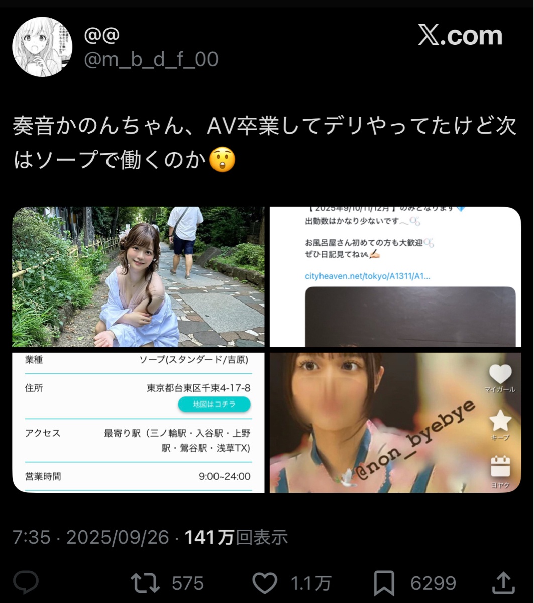 奏音かのんちゃん、AV卒業してデリやってたけど次はソープで働くのか😲 pic.twitter.com/UBzoVfTWwt