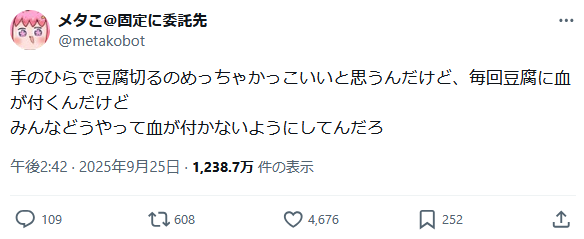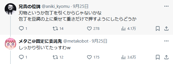 — メタこ@固定に委託先 (@metakobot) September 26, 2025