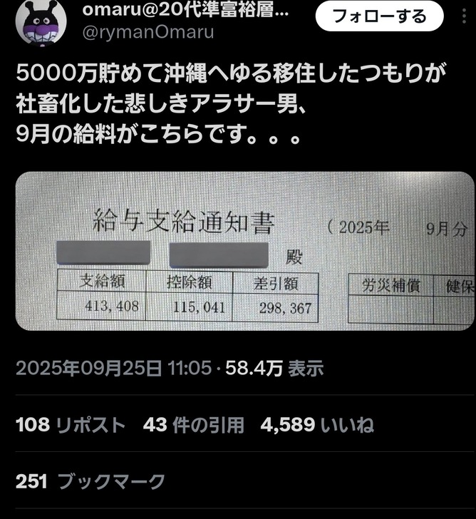 9月の給料がこちらです。。。 pic.twitter.com/l1bEV5EiRF— omaru@20代準富裕層→沖縄移住🌺 (@rymanOmaru) September 25, 2025