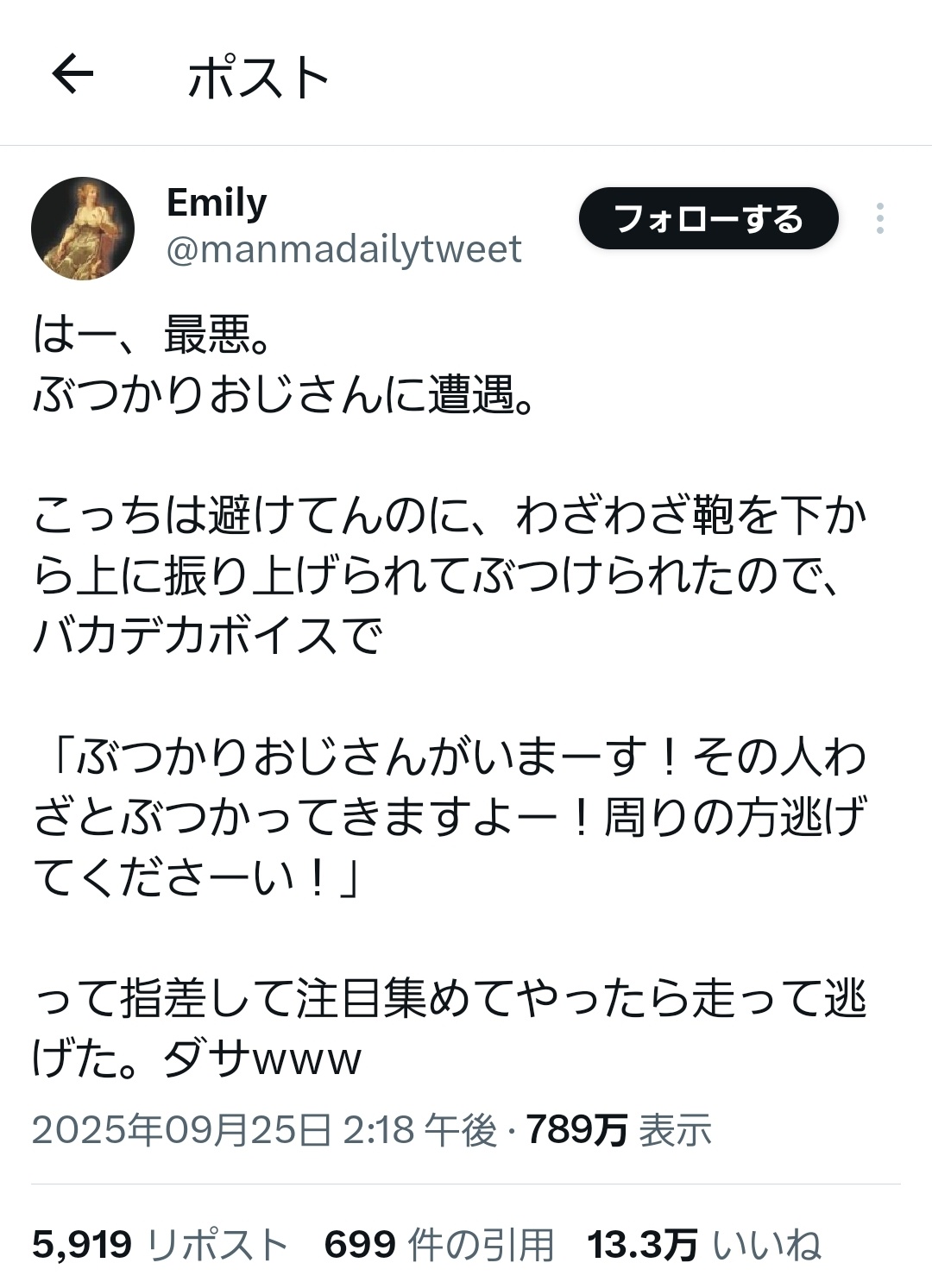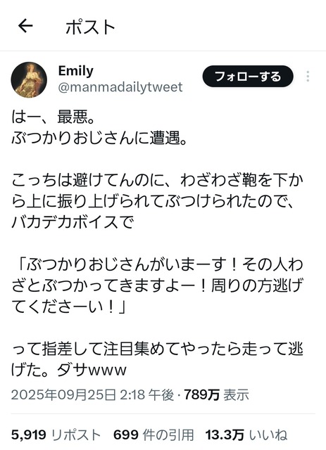 ぶつかりおじさんは女狙ってぶつかってんのが最高にダサいw