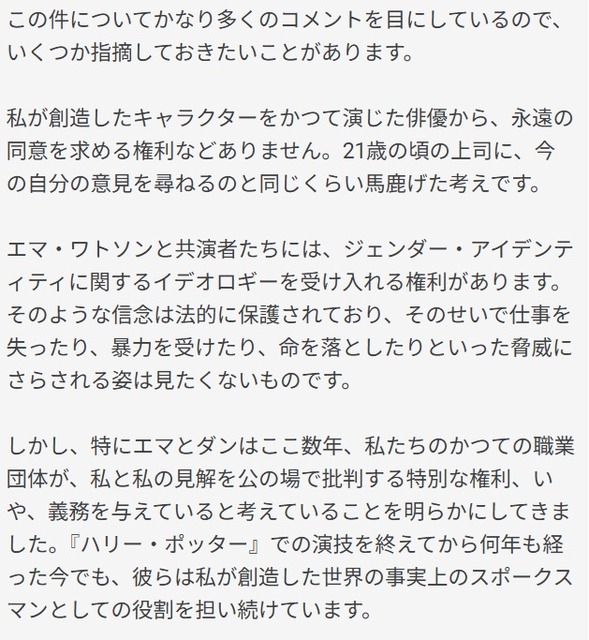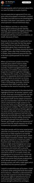 J.K.ローリング氏がエマ・ワトソンについて、絶縁宣言ととれる長文を投稿。「さすがは人気作家」と言いたくなる、落ち着いて説得力のある筆致…。