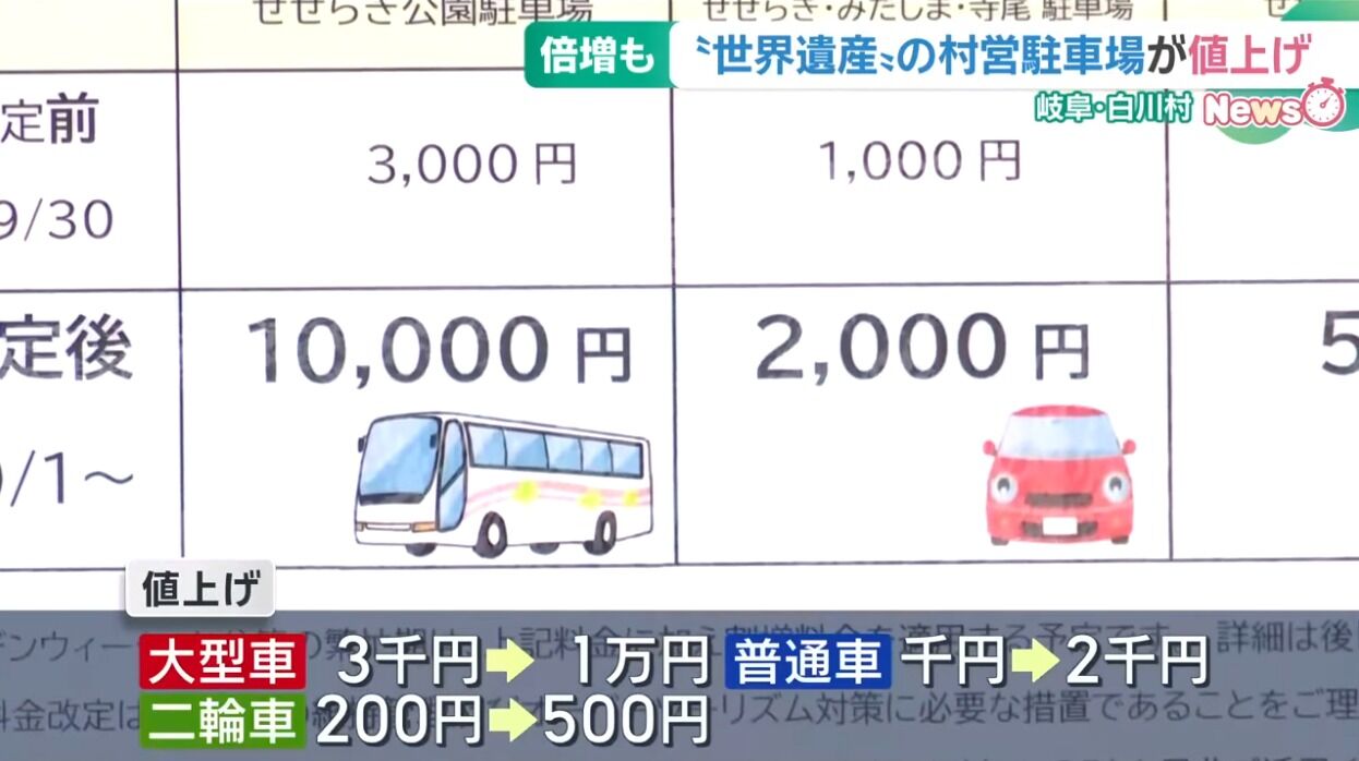 値上げはオーバーツーリズム対策の一環で、普通車が1000円から2000円に、二輪車が200円から500円になる。利用料金は、駐車場の維持管理や合掌造り集落の景観保全などに充てられる。 pic.twitter.com/DybC909jkw