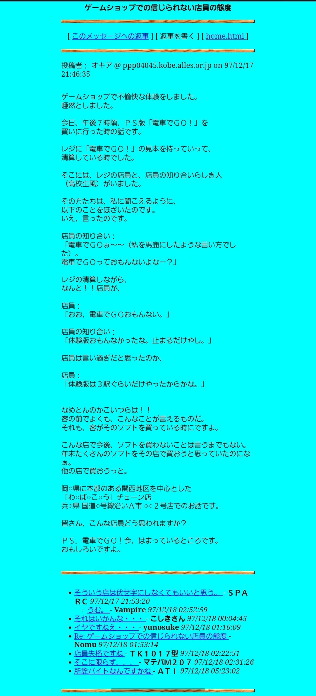 【97年】(ヽ´ん`)「ゲームショップで不愉快な思いをした」 2025/10/3 カオスちゃんねる 1: 名無しさん@おーぷん 25/10/03(金) 08:07:43 ID:sJr9 2: 名無しさん@おーぷん 25/10/03(金) 08:08:26 ID:cMLV 97年は草 泣ける2ちゃんねる (2ch+BOOKS(1)) 続きを読む Source: カオスちゃんねる