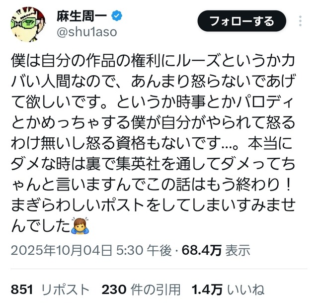【悲報】コスプレイヤー、人気漫画のキャラを無断コスプレ→原作者が反応して謝罪する事態になる 2025/10/5 キニ速 1:名無し :2025/10/05(日) 07:01:34.115ID:V7zvDUVxl 2:名無し :2025/10/05(日) 07:01:46.437ID:V7zvDUVxl 23:名無し :2025/10/05(日) 07:12:23.895ID:4EXOoHVBK >>2 これ本当にだめなやつやん 26:名無し :2025/10/05(日) 07:15:59.100ID:RTaMCdTHS >>2 めちゃくちゃ懐の深いええ作者でよかったな 続きを読む Source: キニ速