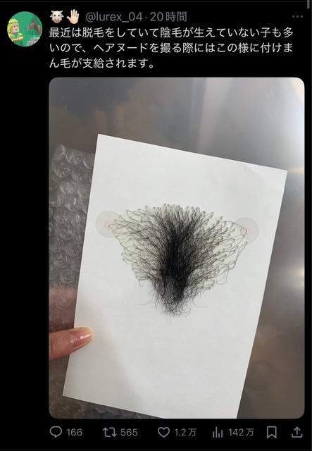 最近は脱毛をしていて陰毛が生えていない子も多いので、ヘアヌードを撮る際にはこの様に付けまん毛が支給されます。 pic.twitter.com/EYYsXqm3tg
