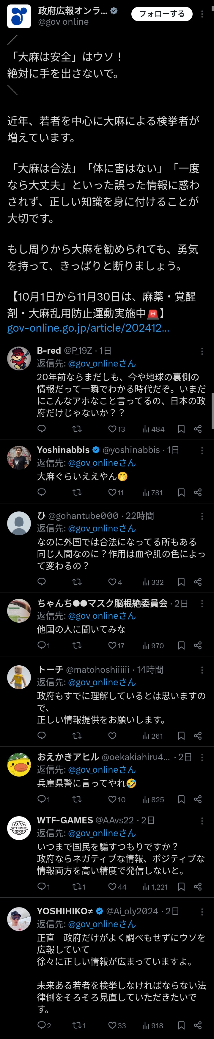 政府公式X「大麻が安全というのはウソ!」リプ欄→「ウソつくなよ」「海外では合法なんだが?」「政府が騙そうとしてる」