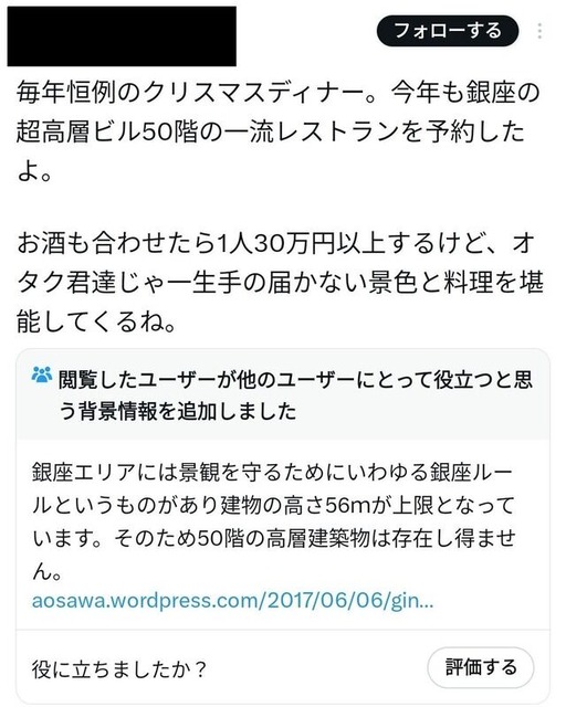 【悲報】強者女さん「50階で30万のディナー。オタク君は一生味わえないだろうねwwwww」→結果