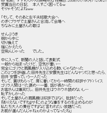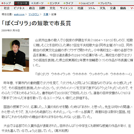 昨年春、千葉市内の動物園でゴリラを見て、「ゴリラも人と同じように孤独なのではないかと感じた」そうで、その孤独感を表現したかったという。ゴリラのイメージを文字で表すなら「ウ」と「ホ」だったので、そのふたつでまとめるようにした。書き始めて30分ほどで完成したという。選者の田井安曇さん(78)は「素手でつかんだ本音を歌っているユニークないい歌だ」と評価する。