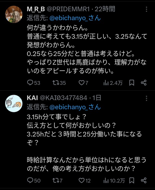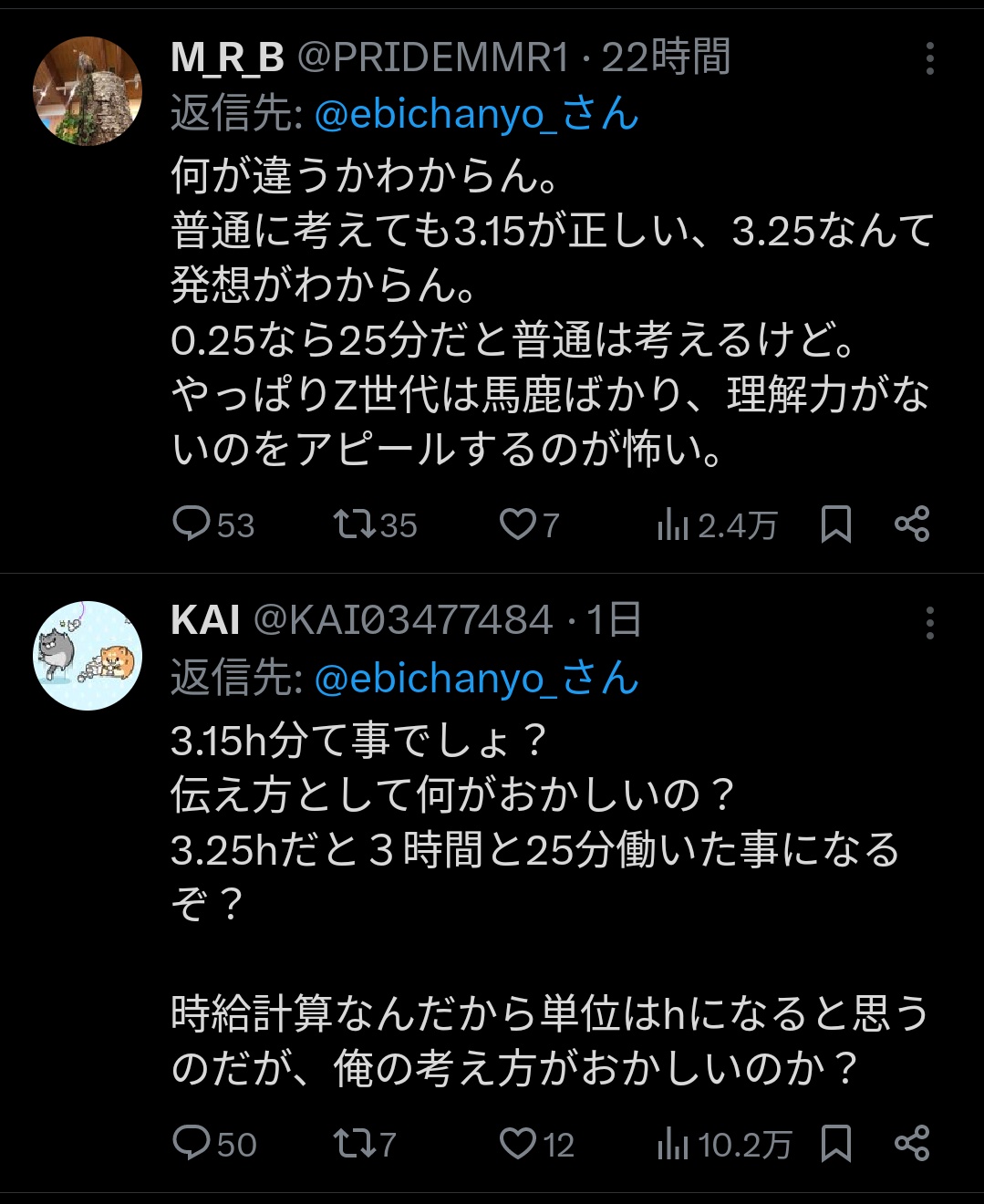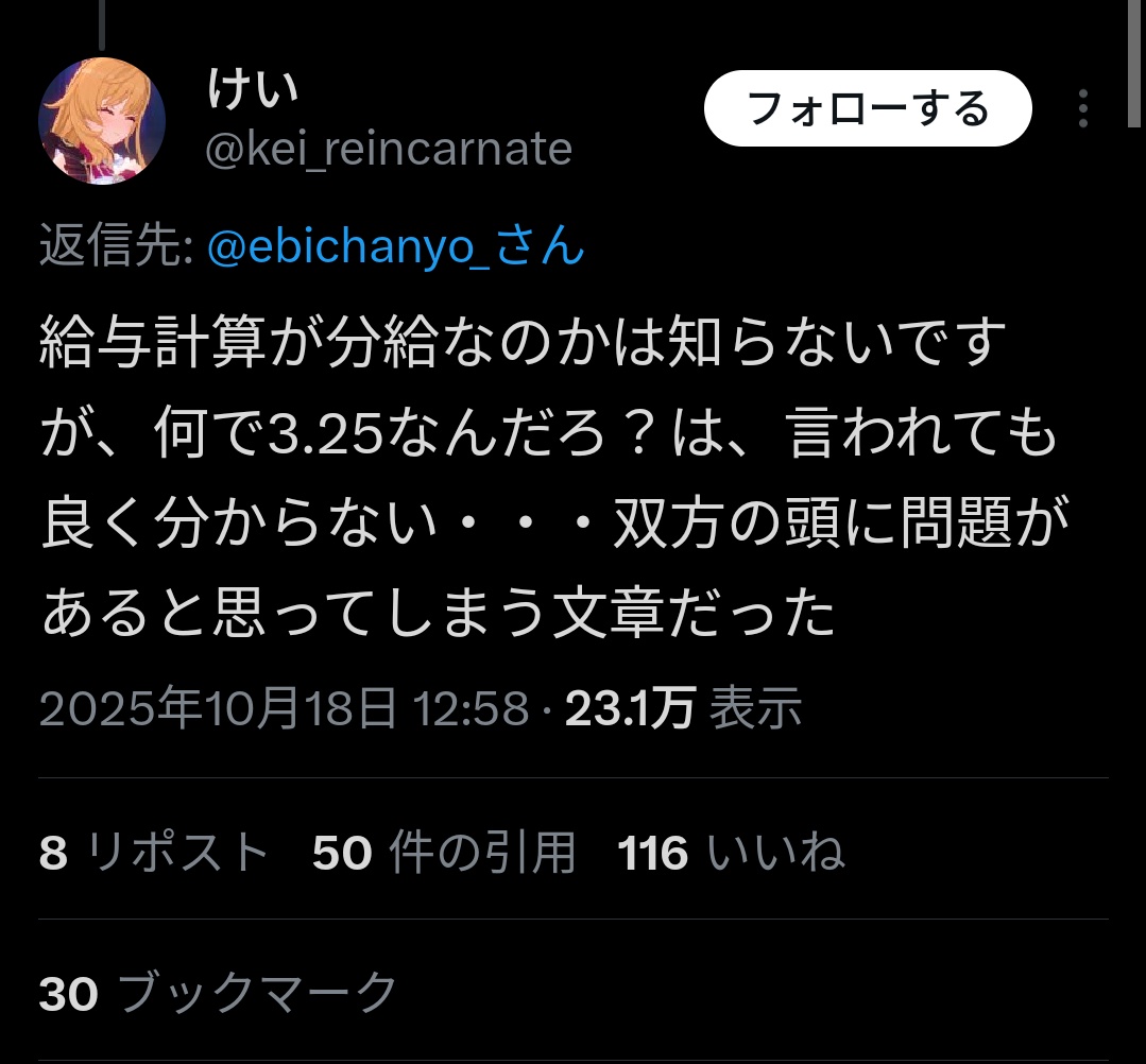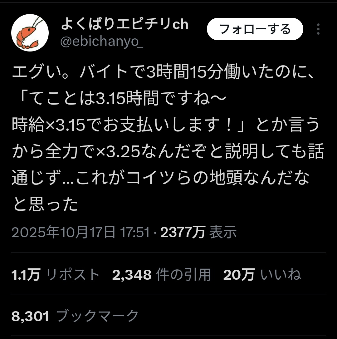 時給×3.15でお支払いします!」とか言うから全力で×3.25なんだぞと説明しても話通じず…これがコイツらの地頭なんだなと思った— よくばりエビチリch (@ebichanyo_) October 17, 2025