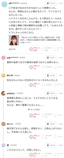 【動画】益若つばささん、表情筋が動かず「アンドロイドみたい」言われてしまう… 2025/10/20 キニ速 1:名無し :2025/10/18(土) 16:08:54.058ID:sYa5kvqUH 美人になった益若つばささん ヤフコメの反応 在りし日の益若つばささん 2:名無し :2025/10/18(土) 16:09:39.885ID:0WaWepSti 面影消滅してて草 24:名無し :2025/10/18(土) 16:31:24.320ID:PVcxacwmO ぱかって顏開きそう 続きを読む Source: キニ速