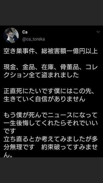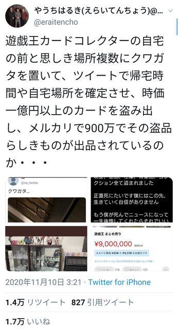 遊戯王カードコレクターの自宅の前と思しき場所複数にクワガタを置いて、ツイートで帰宅時間や自宅場所を確定させ、時価一億円以上のカードを盗み出し、メルカリで900万でその盗品らしきものが出品されているのか・・・ pic.twitter.com/t5KMDZ8CqN